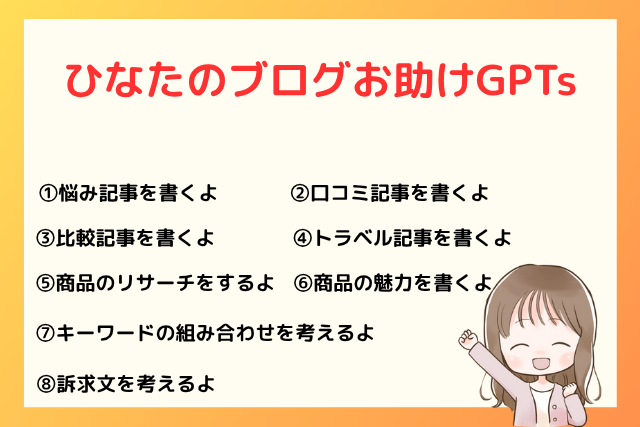 あなたのブログ執筆を加速させる、8つの専用GPTsですよ。